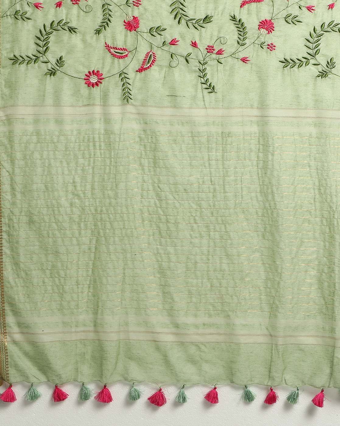 • Yellow linen silk saree has floral embroidered pattern, the pallu has tasseled hem